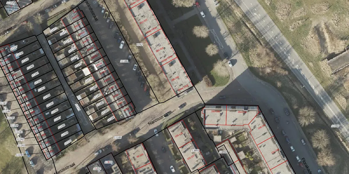 Het perceel waarop Narcisstraat 10-ab staat heeft een oppervlakte van 1638 m². Dit is een zeer groot perceel. De perceeloppervlakte wordt geregistreerd door het Kadaster. Gedetailleerde informatie over de maten van dit perceel kunt u vinden in het rapport Kadastrale kaart met maatvoering van Narcisstraat 10-ab.