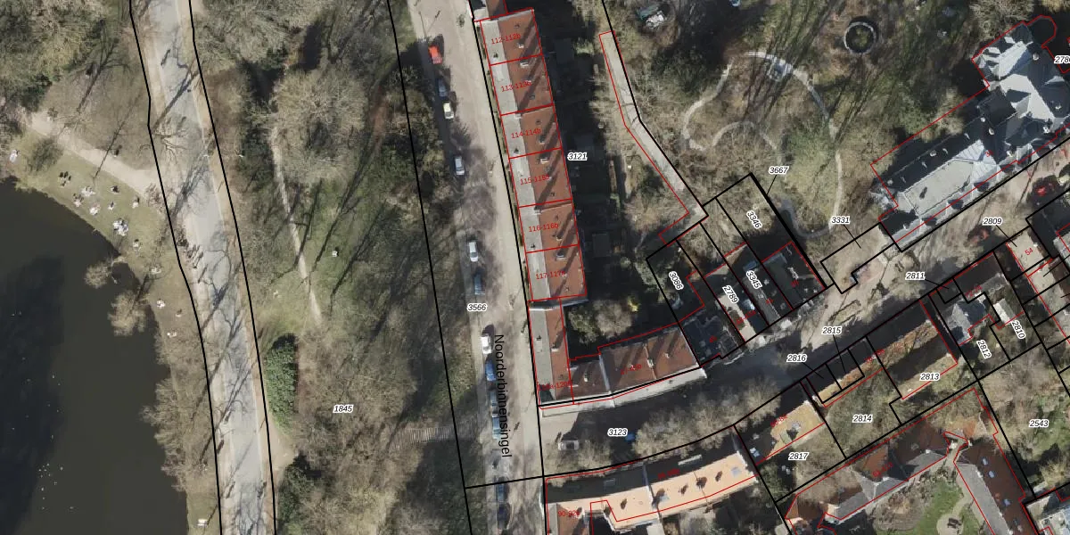 Het perceel waarop Noorderbinnensingel 117 staat heeft een oppervlakte van 2453 m². Dit is een zeer groot perceel. De perceeloppervlakte wordt geregistreerd door het Kadaster. Gedetailleerde informatie over de maten van dit perceel kunt u vinden in het rapport Kadastrale kaart met maatvoering van Noorderbinnensingel 117.