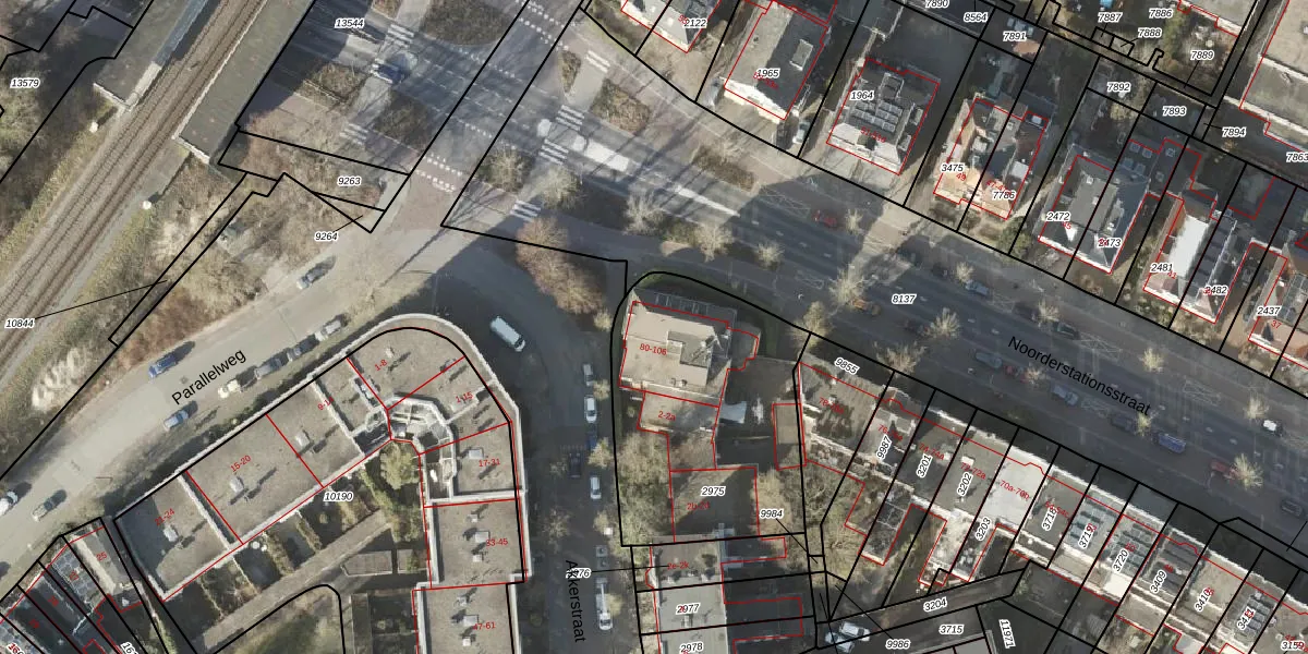 Het perceel waarop Noorderstationsstraat 100 staat heeft een oppervlakte van 1068 m². Dit is een zeer groot perceel. De perceeloppervlakte wordt geregistreerd door het Kadaster. Gedetailleerde informatie over de maten van dit perceel kunt u vinden in het rapport Kadastrale kaart met maatvoering van Noorderstationsstraat 100.