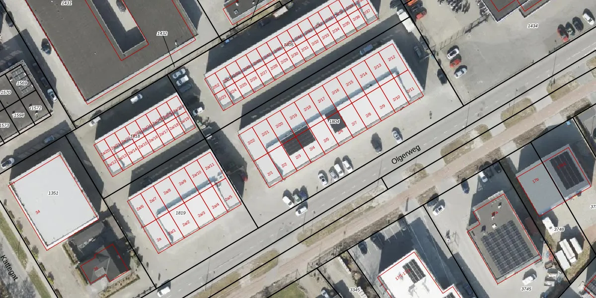 Het perceel waarop Olgerweg 2-3 staat heeft een oppervlakte van 2815 m². Dit is een zeer groot perceel. De perceeloppervlakte wordt geregistreerd door het Kadaster. Gedetailleerde informatie over de maten van dit perceel kunt u vinden in het rapport Kadastrale kaart met maatvoering van Olgerweg 2-3.