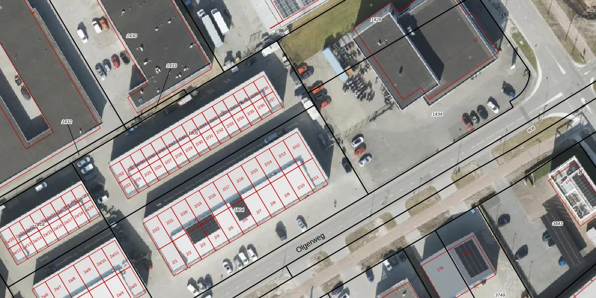 Het perceel waarop Olgerweg 2-12 staat heeft een oppervlakte van 2815 m². Dit is een zeer groot perceel. De perceeloppervlakte wordt geregistreerd door het Kadaster. Gedetailleerde informatie over de maten van dit perceel kunt u vinden in het rapport Kadastrale kaart met maatvoering van Olgerweg 2-12.