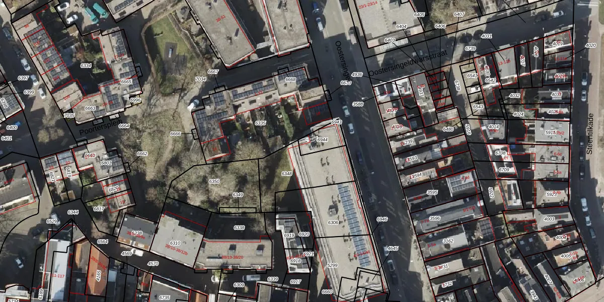 Oostersingel 14-15 is gelegen op kadastraal perceel GNG00G6944. Deze kadastrale aanduiding is uniek en wordt gebruikt door het Kadaster om eigendomsrechten en andere zakelijke rechten vast te leggen. Het perceel maakt onderdeel uit van de kadastrale gemeente Groningen.