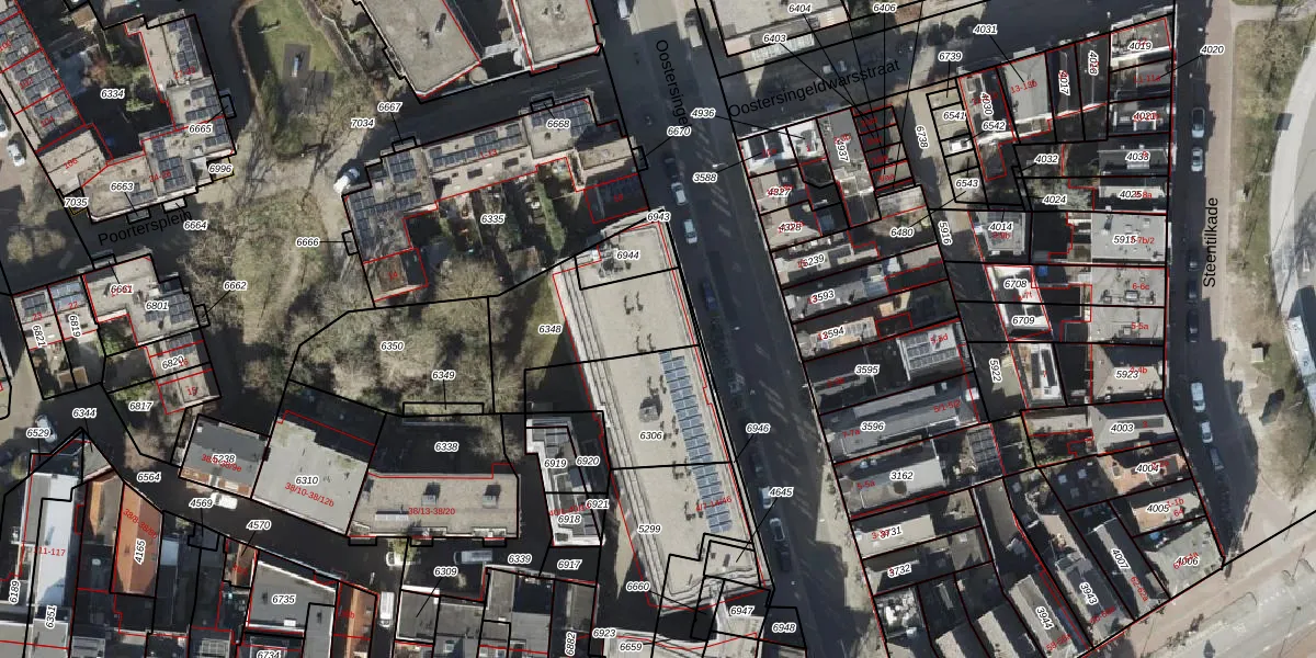 Het perceel waarop Oostersingel 6-42 staat heeft een oppervlakte van 425 m². Dit is een groot perceel. De perceeloppervlakte wordt geregistreerd door het Kadaster. Gedetailleerde informatie over de maten van dit perceel kunt u vinden in het rapport Kadastrale kaart met maatvoering van Oostersingel 6-42.