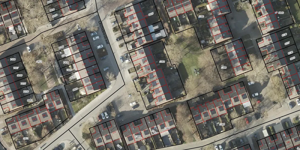 Het perceel waarop Orchideestraat 185 staat heeft een oppervlakte van 1047 m². Dit is een zeer groot perceel. De perceeloppervlakte wordt geregistreerd door het Kadaster. Gedetailleerde informatie over de maten van dit perceel kunt u vinden in het rapport Kadastrale kaart met maatvoering van Orchideestraat 185.