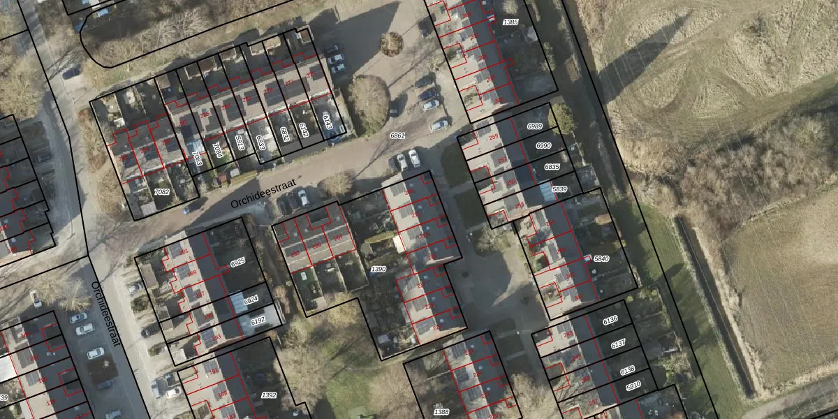 Het perceel waarop Orchideestraat 211 staat heeft een oppervlakte van 1257 m². Dit is een zeer groot perceel. De perceeloppervlakte wordt geregistreerd door het Kadaster. Gedetailleerde informatie over de maten van dit perceel kunt u vinden in het rapport Kadastrale kaart met maatvoering van Orchideestraat 211.