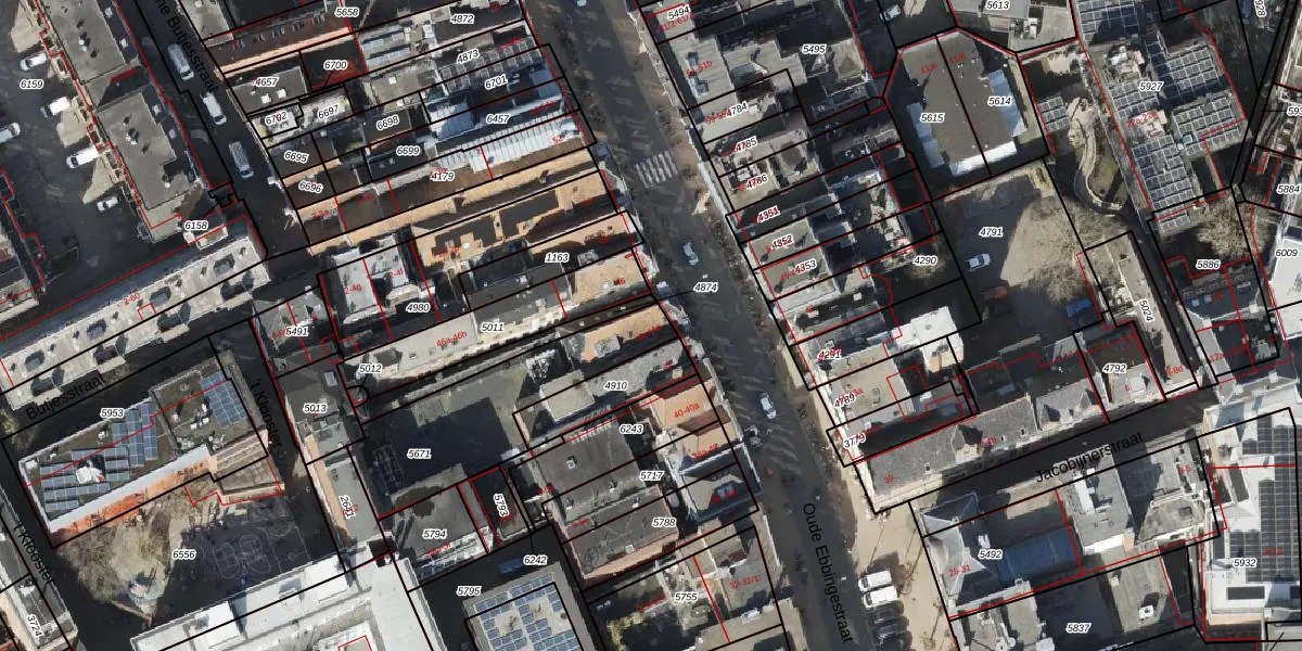 Het perceel waarop Oude Ebbingestraat 44 staat heeft een oppervlakte van 557 m². Dit is een groot perceel. De perceeloppervlakte wordt geregistreerd door het Kadaster. Gedetailleerde informatie over de maten van dit perceel kunt u vinden in het rapport Kadastrale kaart met maatvoering van Oude Ebbingestraat 44.