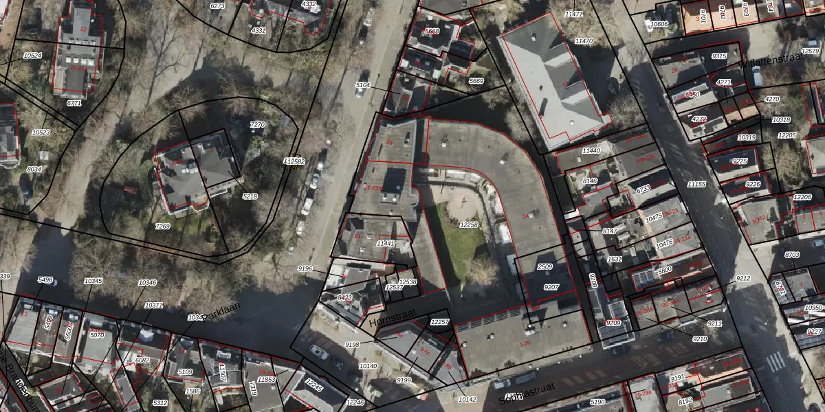 Het perceel waarop Parklaan 22-9 staat heeft een oppervlakte van 2335 m². Dit is een zeer groot perceel. De perceeloppervlakte wordt geregistreerd door het Kadaster. Gedetailleerde informatie over de maten van dit perceel kunt u vinden in het rapport Kadastrale kaart met maatvoering van Parklaan 22-9.