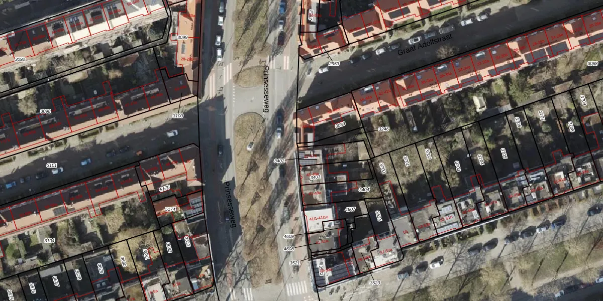Prinsesseweg 47 is gelegen op kadastraal perceel GNG00D3402. Deze kadastrale aanduiding is uniek en wordt gebruikt door het Kadaster om eigendomsrechten en andere zakelijke rechten vast te leggen. Het perceel maakt onderdeel uit van de kadastrale gemeente Groningen.