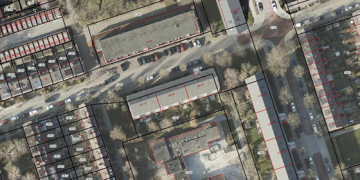 Prunusstraat 54 is gelegen op kadastraal perceel GNG00L1395. Deze kadastrale aanduiding is uniek en wordt gebruikt door het Kadaster om eigendomsrechten en andere zakelijke rechten vast te leggen. Het perceel maakt onderdeel uit van de kadastrale gemeente Groningen.