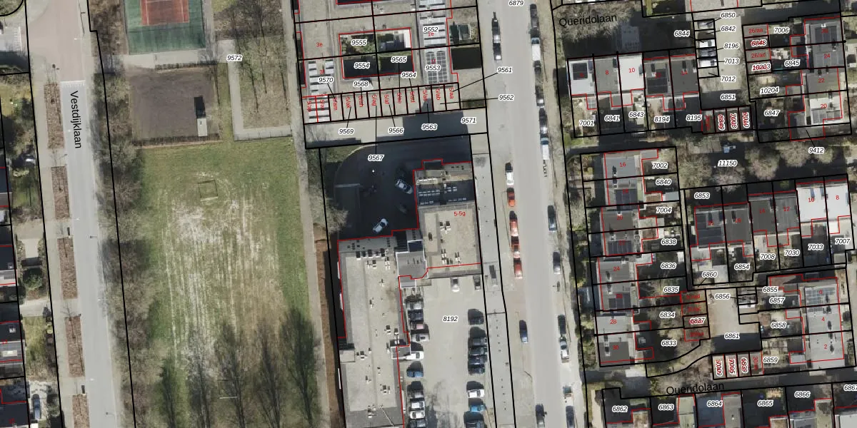 Het perceel waarop Queridolaan 5-f staat heeft een oppervlakte van 2521 m². Dit is een zeer groot perceel. De perceeloppervlakte wordt geregistreerd door het Kadaster. Gedetailleerde informatie over de maten van dit perceel kunt u vinden in het rapport Kadastrale kaart met maatvoering van Queridolaan 5-f.