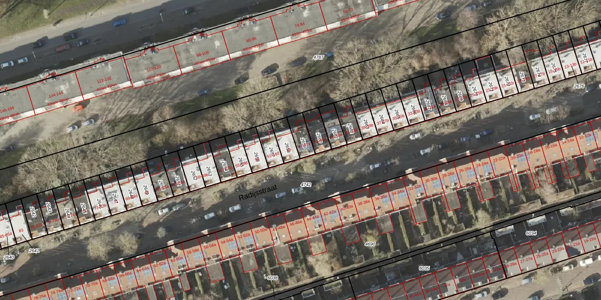 Het perceel waarop Radijsstraat 47 staat heeft een oppervlakte van 82 m². Dit is een klein perceel. De perceeloppervlakte wordt geregistreerd door het Kadaster. Gedetailleerde informatie over de maten van dit perceel kunt u vinden in het rapport Kadastrale kaart met maatvoering van Radijsstraat 47.