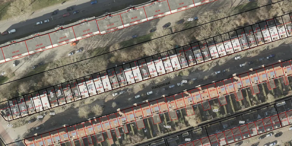 Het perceel waarop Radijsstraat 57-b staat heeft een oppervlakte van 81 m². Dit is een klein perceel. De perceeloppervlakte wordt geregistreerd door het Kadaster. Gedetailleerde informatie over de maten van dit perceel kunt u vinden in het rapport Kadastrale kaart met maatvoering van Radijsstraat 57-b.
