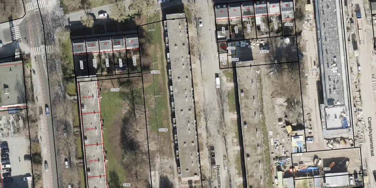 Het perceel waarop Reviusstraat 91 staat heeft een oppervlakte van 2608 m². Dit is een zeer groot perceel. De perceeloppervlakte wordt geregistreerd door het Kadaster. Gedetailleerde informatie over de maten van dit perceel kunt u vinden in het rapport Kadastrale kaart met maatvoering van Reviusstraat 91.