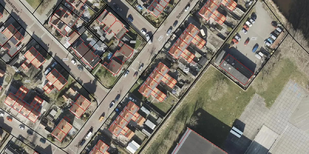 Het perceel waarop Schoenerstraat 20 staat heeft een oppervlakte van 4929 m². Dit is een zeer groot perceel. De perceeloppervlakte wordt geregistreerd door het Kadaster. Gedetailleerde informatie over de maten van dit perceel kunt u vinden in het rapport Kadastrale kaart met maatvoering van Schoenerstraat 20.