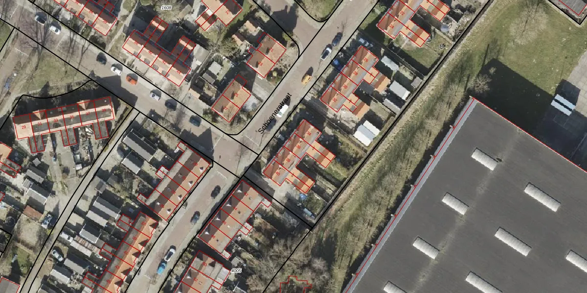 Het perceel waarop Schoenerstraat 36 staat heeft een oppervlakte van 4929 m². Dit is een zeer groot perceel. De perceeloppervlakte wordt geregistreerd door het Kadaster. Gedetailleerde informatie over de maten van dit perceel kunt u vinden in het rapport Kadastrale kaart met maatvoering van Schoenerstraat 36.