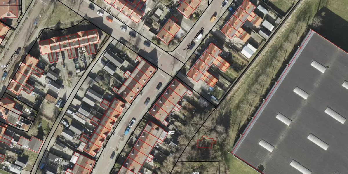 Het perceel waarop Schoenerstraat 42 staat heeft een oppervlakte van 2696 m². Dit is een zeer groot perceel. De perceeloppervlakte wordt geregistreerd door het Kadaster. Gedetailleerde informatie over de maten van dit perceel kunt u vinden in het rapport Kadastrale kaart met maatvoering van Schoenerstraat 42.