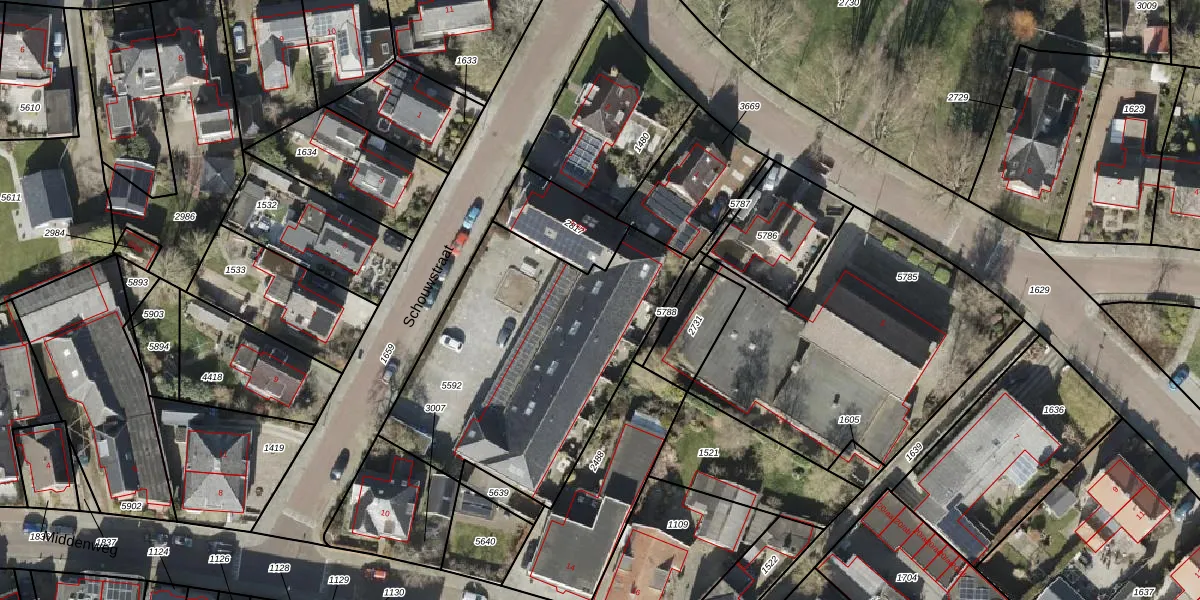 Het perceel waarop Schouwstraat 6-2 staat heeft een oppervlakte van 1347 m². Dit is een zeer groot perceel. De perceeloppervlakte wordt geregistreerd door het Kadaster. Gedetailleerde informatie over de maten van dit perceel kunt u vinden in het rapport Kadastrale kaart met maatvoering van Schouwstraat 6-2.