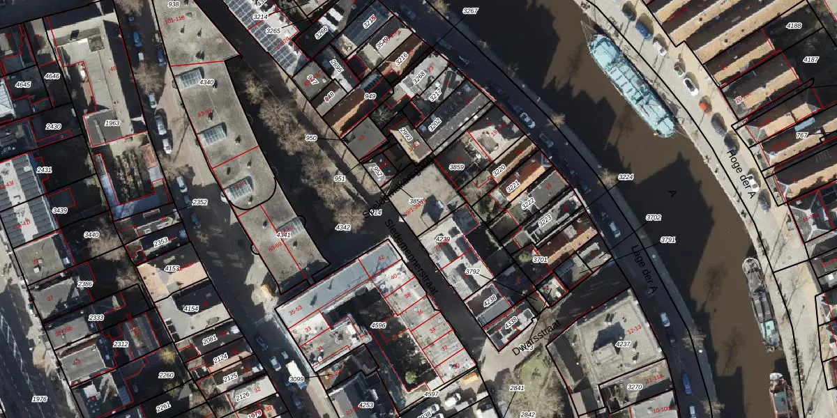 Het adres is gelegen op perceel 3859 in de sectie K en de kadastrale gemeente Groningen. De kadastrale aanduiding is aldus GNG00-K-3859. Het perceel is kleiner dan gemiddeld in Groningen. Het perceel is 389 m² groot, terwijl het gemiddelde ligt op 770,65 m². Het kleinste perceel in de kadastrale gemeente is 0 m² groot. De grootste perceeloppervlakte is 31,8 ha. Er zijn 21 adressen aanwezig op het perceel. De huidige grenzen van het perceel zijn digitaal in de Basisregistratie Kadaster (BRK) geregistreerd op 20-06-2003.