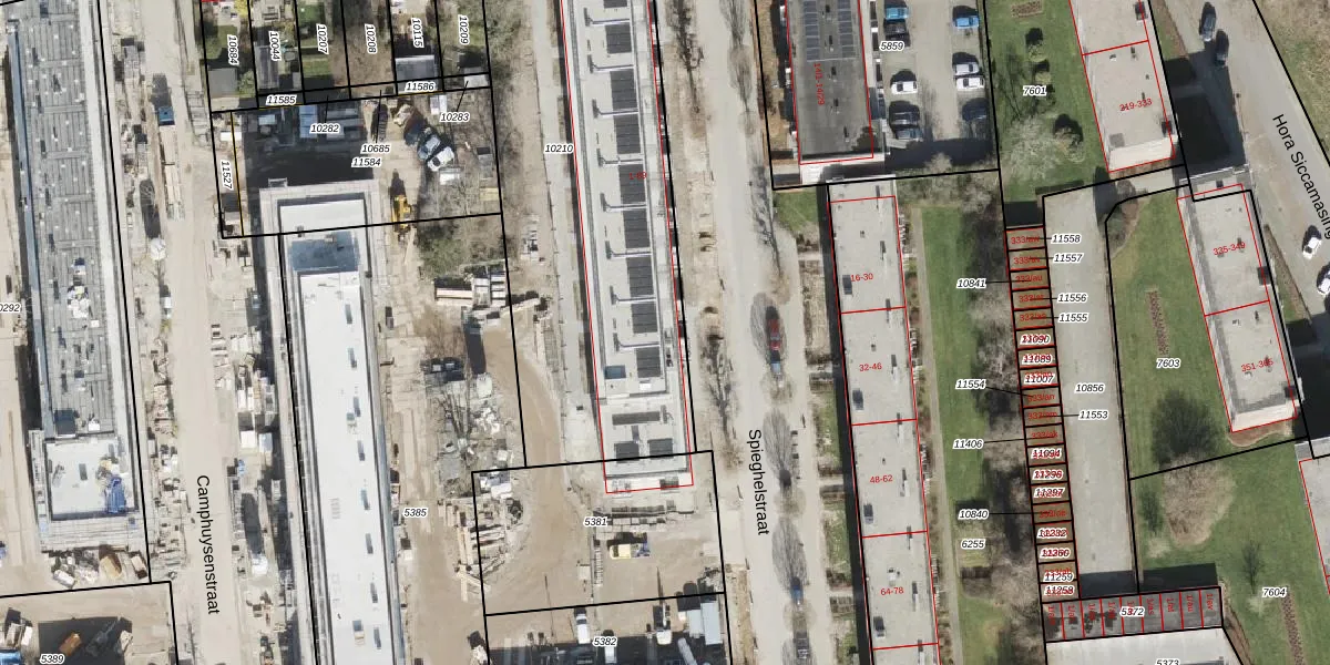 Het perceel waarop Spieghelstraat 5 staat heeft een oppervlakte van 2285 m². Dit is een zeer groot perceel. De perceeloppervlakte wordt geregistreerd door het Kadaster. Gedetailleerde informatie over de maten van dit perceel kunt u vinden in het rapport Kadastrale kaart met maatvoering van Spieghelstraat 5.