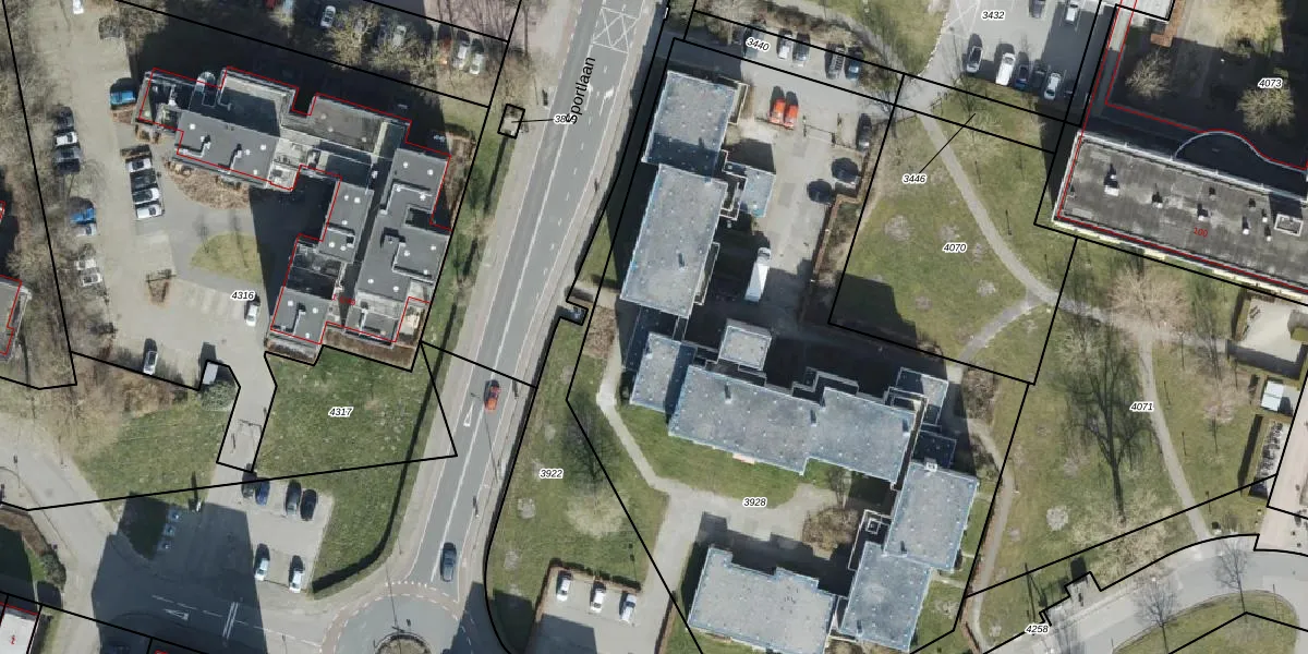 Het perceel waarop Sportlaan 100 staat heeft een oppervlakte van 4374 m². Dit is een zeer groot perceel. De perceeloppervlakte wordt geregistreerd door het Kadaster. Gedetailleerde informatie over de maten van dit perceel kunt u vinden in het rapport Kadastrale kaart met maatvoering van Sportlaan 100.