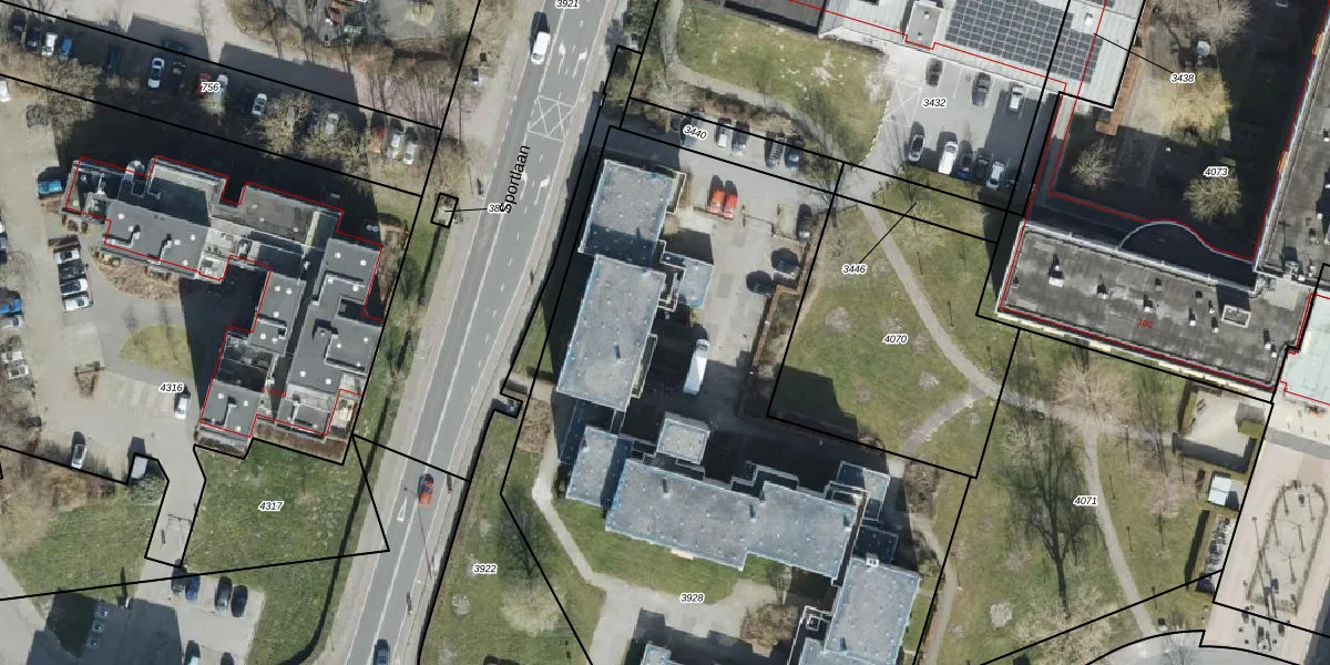 Het perceel waarop Sportlaan 86 staat heeft een oppervlakte van 4374 m². Dit is een zeer groot perceel. De perceeloppervlakte wordt geregistreerd door het Kadaster. Gedetailleerde informatie over de maten van dit perceel kunt u vinden in het rapport Kadastrale kaart met maatvoering van Sportlaan 86.
