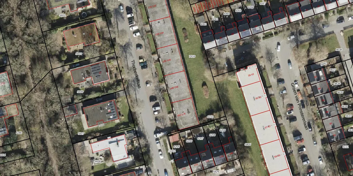 Het perceel waarop Thorbeckelaan 156 staat heeft een oppervlakte van 2146 m². Dit is een zeer groot perceel. De perceeloppervlakte wordt geregistreerd door het Kadaster. Gedetailleerde informatie over de maten van dit perceel kunt u vinden in het rapport Kadastrale kaart met maatvoering van Thorbeckelaan 156.