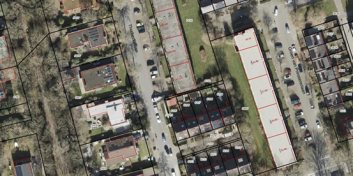 Het perceel waarop Thorbeckelaan 164 staat heeft een oppervlakte van 2146 m². Dit is een zeer groot perceel. De perceeloppervlakte wordt geregistreerd door het Kadaster. Gedetailleerde informatie over de maten van dit perceel kunt u vinden in het rapport Kadastrale kaart met maatvoering van Thorbeckelaan 164.