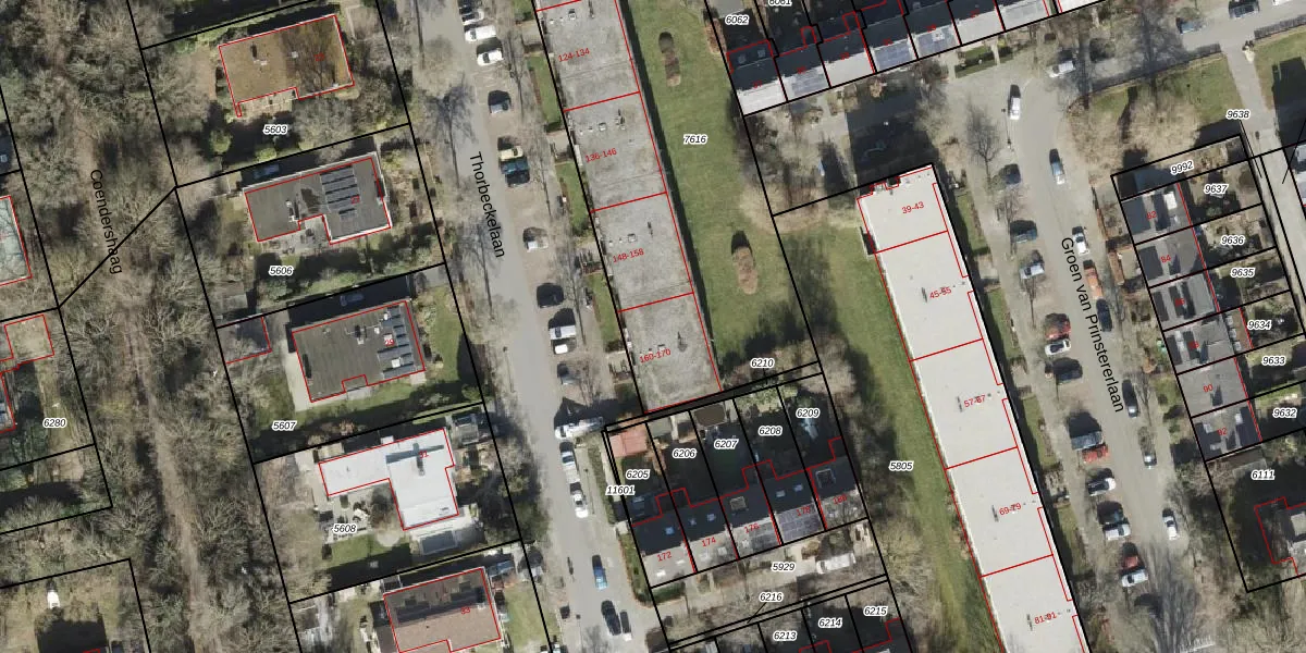 Het perceel waarop Thorbeckelaan 166 staat heeft een oppervlakte van 2146 m². Dit is een zeer groot perceel. De perceeloppervlakte wordt geregistreerd door het Kadaster. Gedetailleerde informatie over de maten van dit perceel kunt u vinden in het rapport Kadastrale kaart met maatvoering van Thorbeckelaan 166.