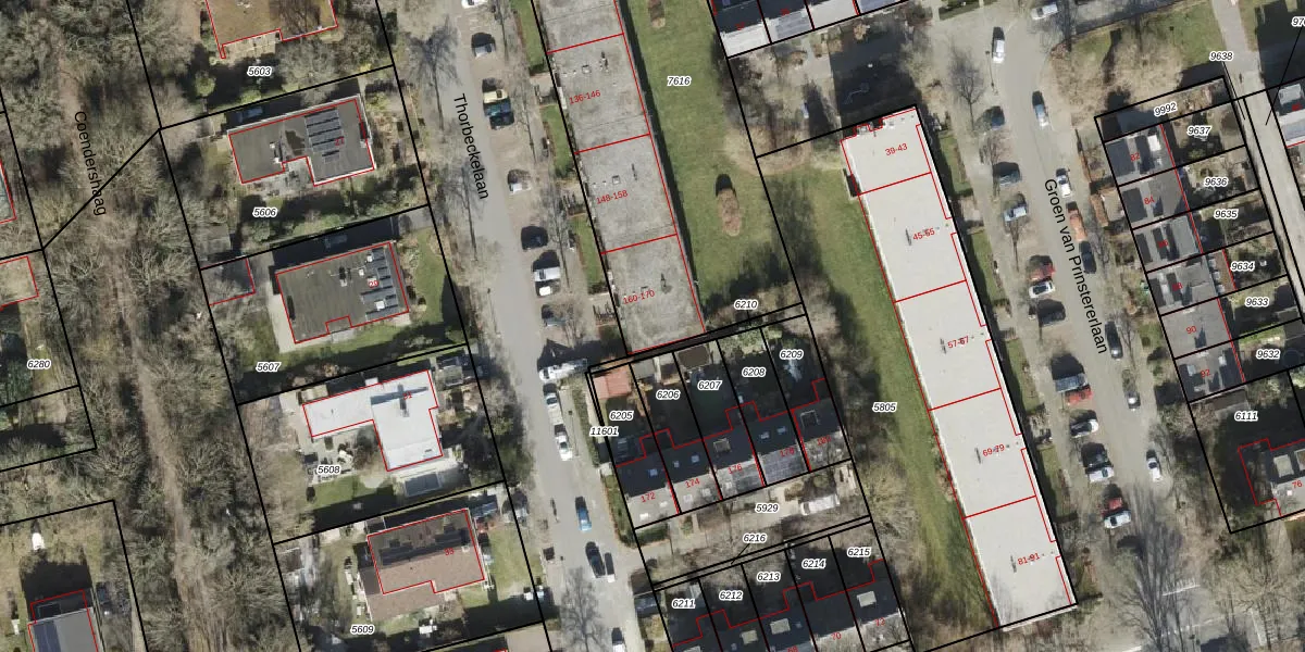 Het perceel waarop Thorbeckelaan 170 staat heeft een oppervlakte van 2146 m². Dit is een zeer groot perceel. De perceeloppervlakte wordt geregistreerd door het Kadaster. Gedetailleerde informatie over de maten van dit perceel kunt u vinden in het rapport Kadastrale kaart met maatvoering van Thorbeckelaan 170.