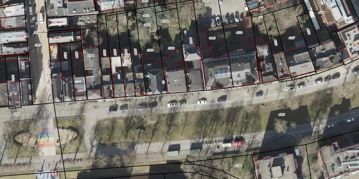 Ubbo Emmiussingel 25 is gelegen op kadastraal perceel GNG00I2549. Deze kadastrale aanduiding is uniek en wordt gebruikt door het Kadaster om eigendomsrechten en andere zakelijke rechten vast te leggen. Het perceel maakt onderdeel uit van de kadastrale gemeente Groningen.