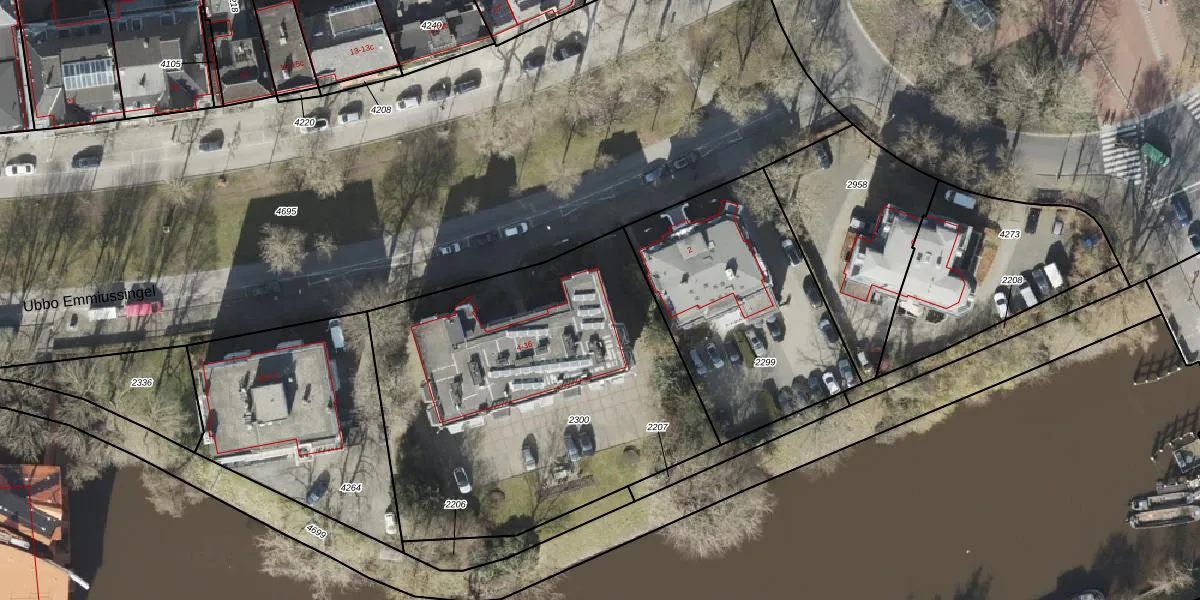 Ubbo Emmiussingel 4-ab is gelegen op kadastraal perceel GNG00I2300. Deze kadastrale aanduiding is uniek en wordt gebruikt door het Kadaster om eigendomsrechten en andere zakelijke rechten vast te leggen. Het perceel maakt onderdeel uit van de kadastrale gemeente Groningen.