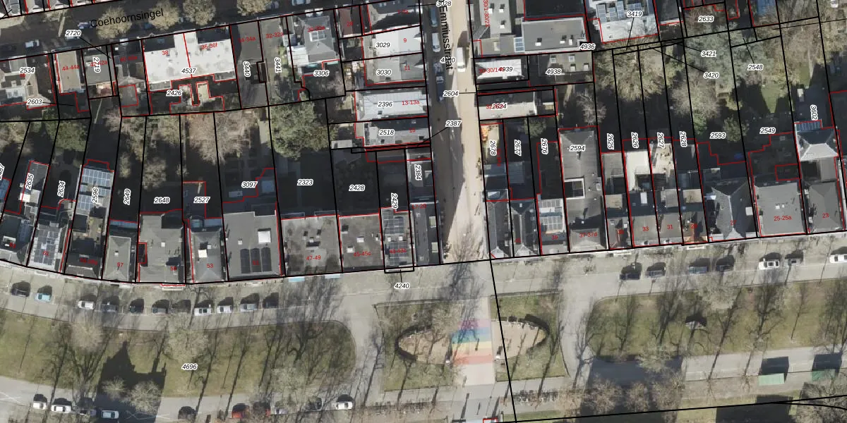 Het adres is gelegen op perceel 2384 in de sectie I en de kadastrale gemeente Groningen. De kadastrale aanduiding is aldus GNG00-I-2384. De gemiddelde perceelgrootte in Groningen is 770,65 m². Dit perceel is kleiner: de perceeloppervlakte bedraagt 169 m². De grootste perceeloppervlakte in de kadastrale gemeente is 31,8 ha. De kleinste oppervlakte bedraagt 0 m². Er zijn 7 adressen aanwezig op het perceel. De laatste wijziging in het de Basisregistratie Kadaster (BRK) was op 02-07-2003.