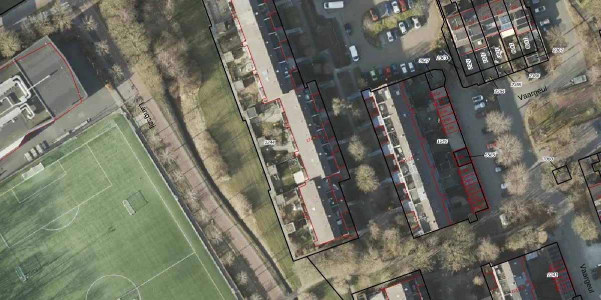 Het perceel waarop Vaargeul 188 staat heeft een oppervlakte van 2304 m². Dit is een zeer groot perceel. De perceeloppervlakte wordt geregistreerd door het Kadaster. Gedetailleerde informatie over de maten van dit perceel kunt u vinden in het rapport Kadastrale kaart met maatvoering van Vaargeul 188.
