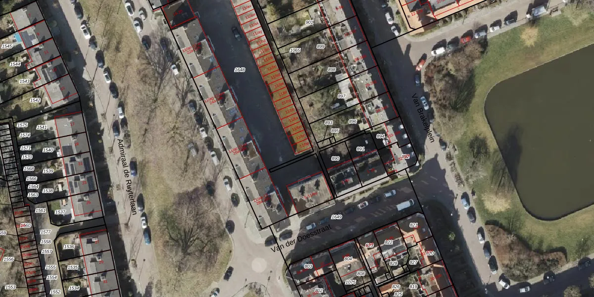 Het perceel waarop Van der Doesstraat 11-bp staat heeft een oppervlakte van 2260 m². Dit is een zeer groot perceel. De perceeloppervlakte wordt geregistreerd door het Kadaster. Gedetailleerde informatie over de maten van dit perceel kunt u vinden in het rapport Kadastrale kaart met maatvoering van Van der Doesstraat 11-bp.
