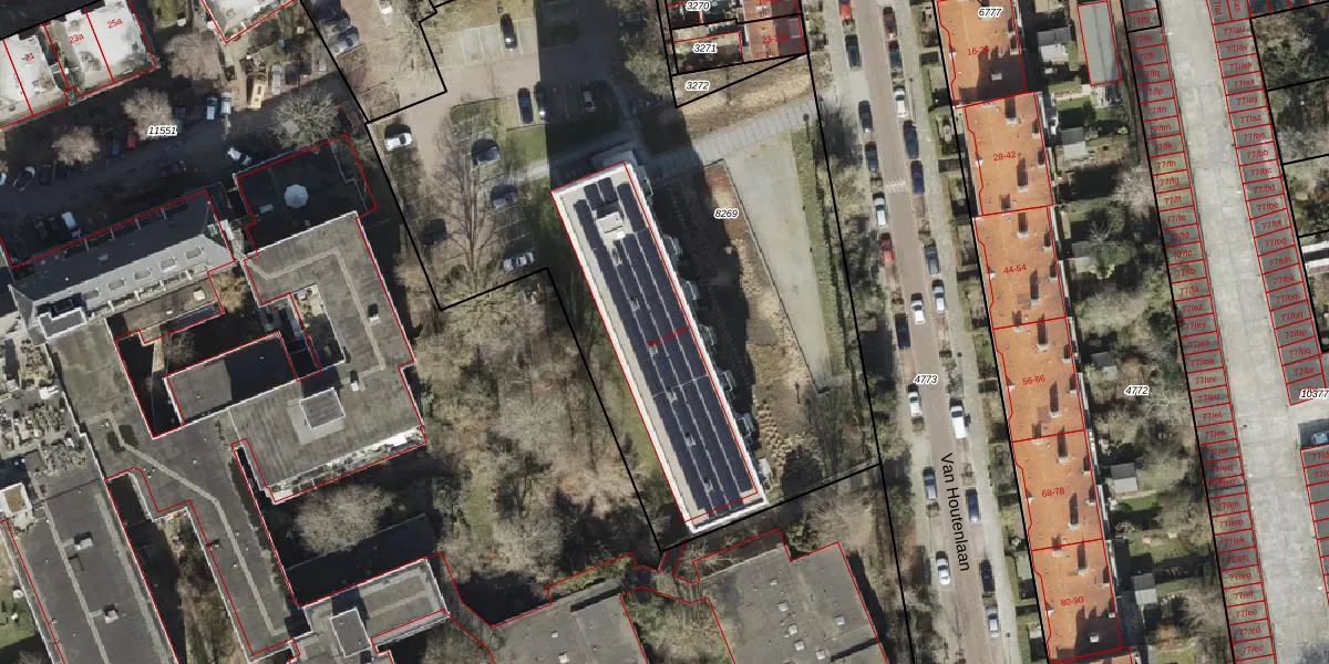 Het perceel waarop Van Houtenlaan 25-12 staat heeft een oppervlakte van 4280 m². Dit is een zeer groot perceel. De perceeloppervlakte wordt geregistreerd door het Kadaster. Gedetailleerde informatie over de maten van dit perceel kunt u vinden in het rapport Kadastrale kaart met maatvoering van Van Houtenlaan 25-12.