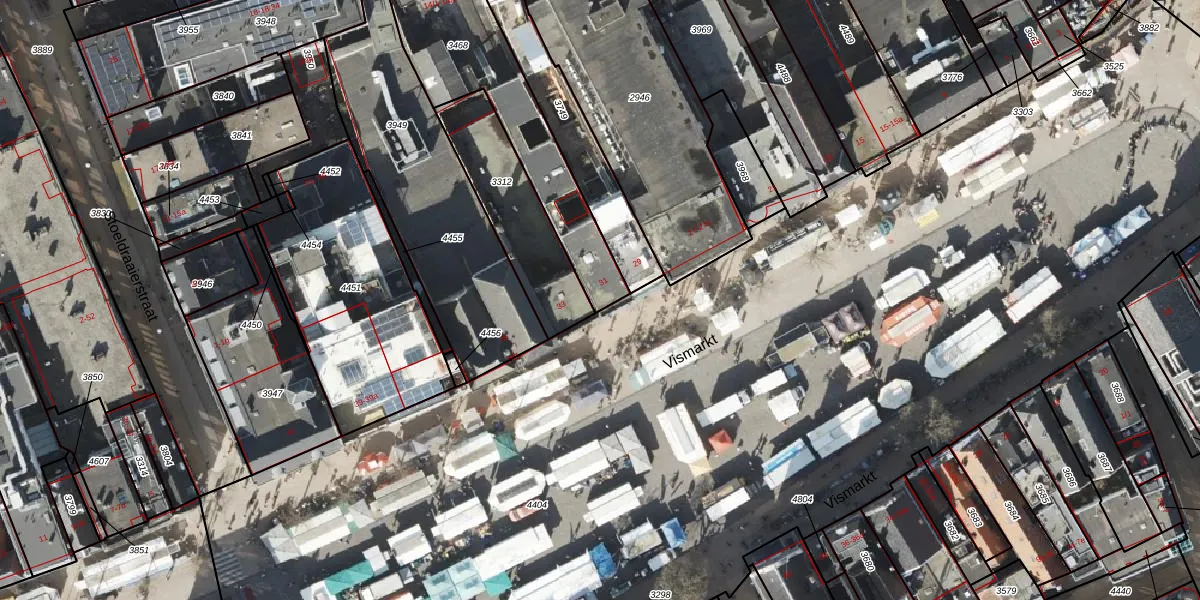 Het perceel waarop Vismarkt 31 staat heeft een oppervlakte van 556 m². Dit is een groot perceel. De perceeloppervlakte wordt geregistreerd door het Kadaster. Gedetailleerde informatie over de maten van dit perceel kunt u vinden in het rapport Kadastrale kaart met maatvoering van Vismarkt 31.