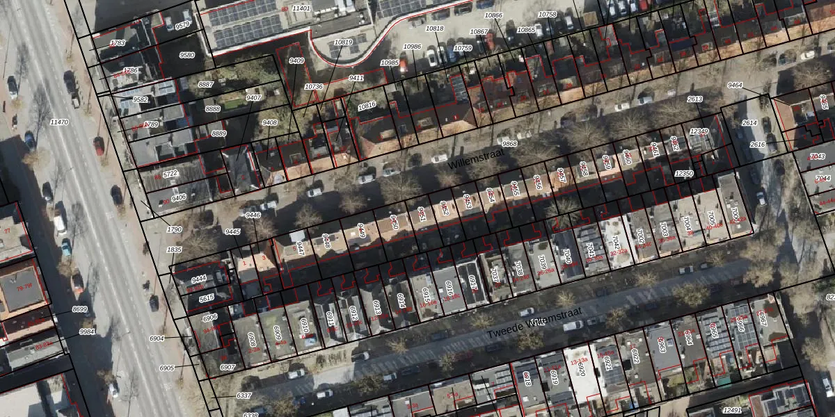 Het perceel waarop Willemstraat 13 staat heeft een oppervlakte van 77 m². Dit is een klein perceel. De perceeloppervlakte wordt geregistreerd door het Kadaster. Gedetailleerde informatie over de maten van dit perceel kunt u vinden in het rapport Kadastrale kaart met maatvoering van Willemstraat 13.