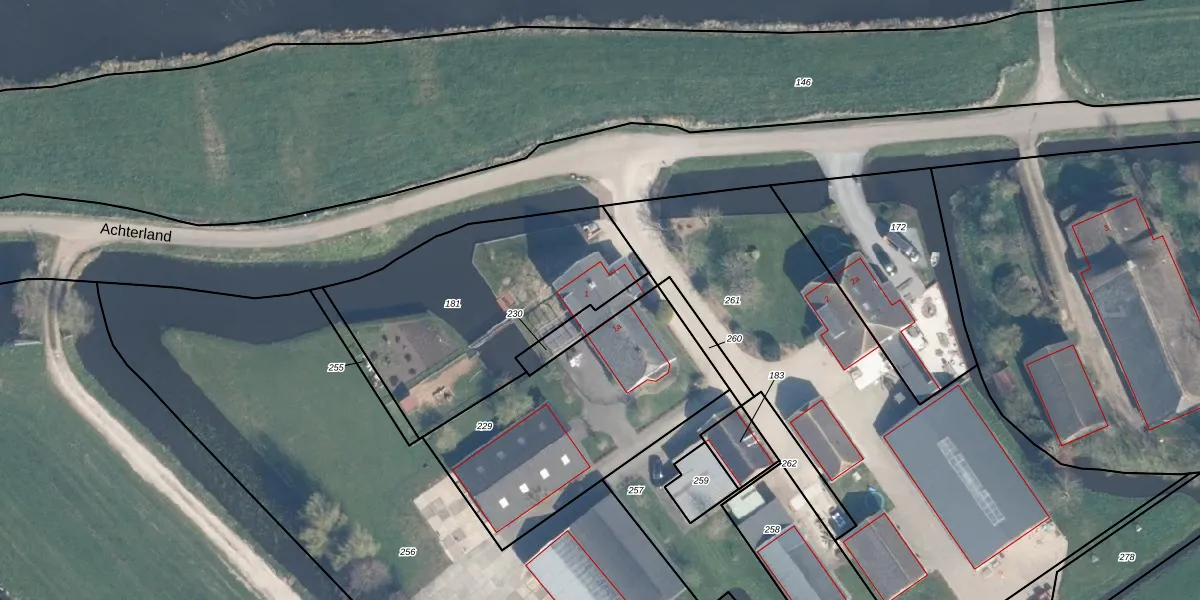 Achterland 1 is gelegen op kadastraal perceel AMS02G181. Deze kadastrale aanduiding is uniek en wordt gebruikt door het Kadaster om eigendomsrechten en andere zakelijke rechten vast te leggen. Het perceel maakt onderdeel uit van de kadastrale gemeente Groot-Ammers.