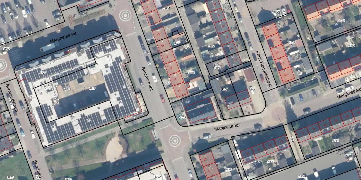 Het perceel waarop Beatrixstraat 23 staat heeft een oppervlakte van 626 m². Dit is een groot perceel. De perceeloppervlakte wordt geregistreerd door het Kadaster. Gedetailleerde informatie over de maten van dit perceel kunt u vinden in het rapport Kadastrale kaart met maatvoering van Beatrixstraat 23.