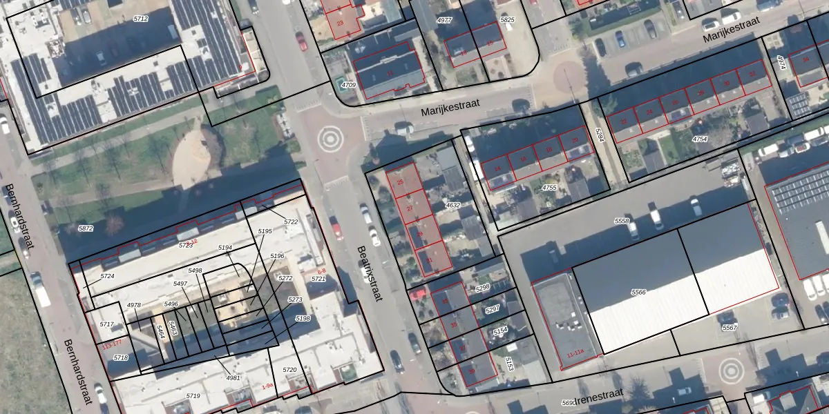 Het perceel waarop Beatrixstraat 27 staat heeft een oppervlakte van 704 m². Dit is een groot perceel. De perceeloppervlakte wordt geregistreerd door het Kadaster. Gedetailleerde informatie over de maten van dit perceel kunt u vinden in het rapport Kadastrale kaart met maatvoering van Beatrixstraat 27.