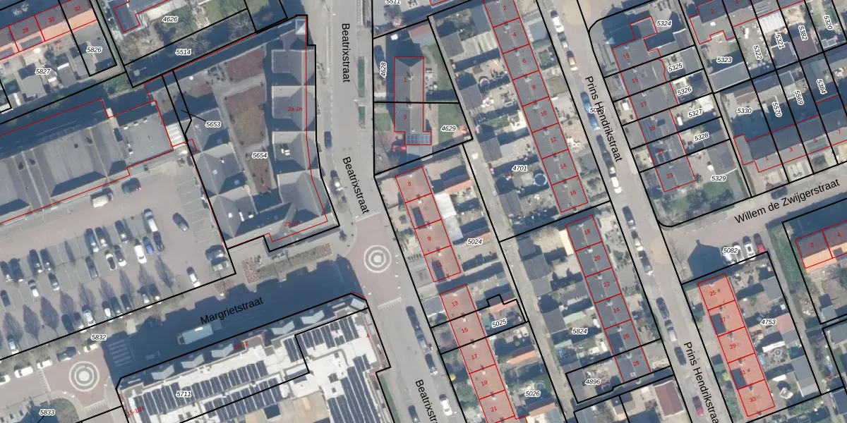 Het perceel waarop Beatrixstraat 7 staat heeft een oppervlakte van 855 m². Dit is een groot perceel. De perceeloppervlakte wordt geregistreerd door het Kadaster. Gedetailleerde informatie over de maten van dit perceel kunt u vinden in het rapport Kadastrale kaart met maatvoering van Beatrixstraat 7.