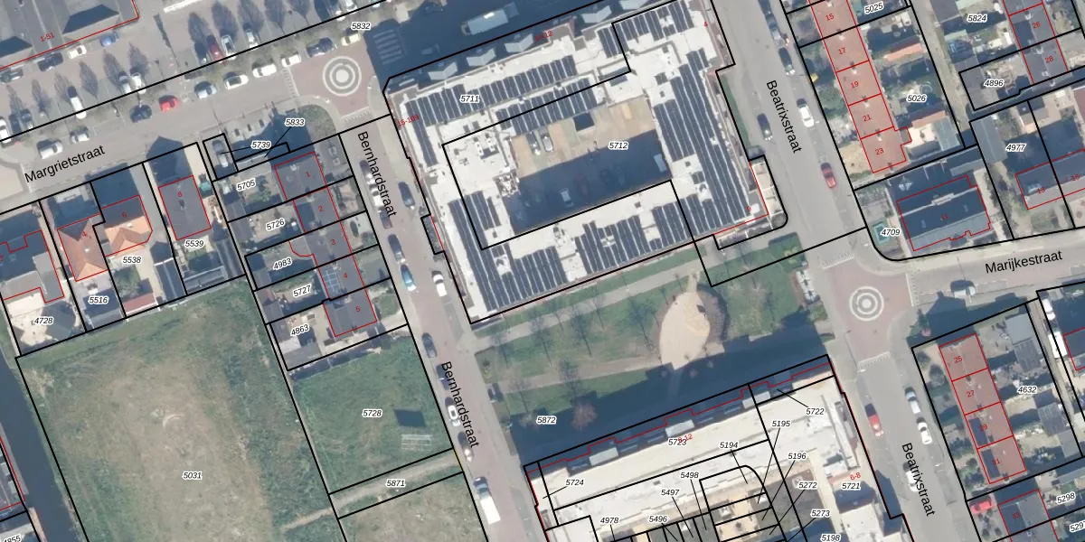 Het perceel waarop Bernhardstraat 75 staat heeft een oppervlakte van 1411 m². Dit is een zeer groot perceel. De perceeloppervlakte wordt geregistreerd door het Kadaster. Gedetailleerde informatie over de maten van dit perceel kunt u vinden in het rapport Kadastrale kaart met maatvoering van Bernhardstraat 75.