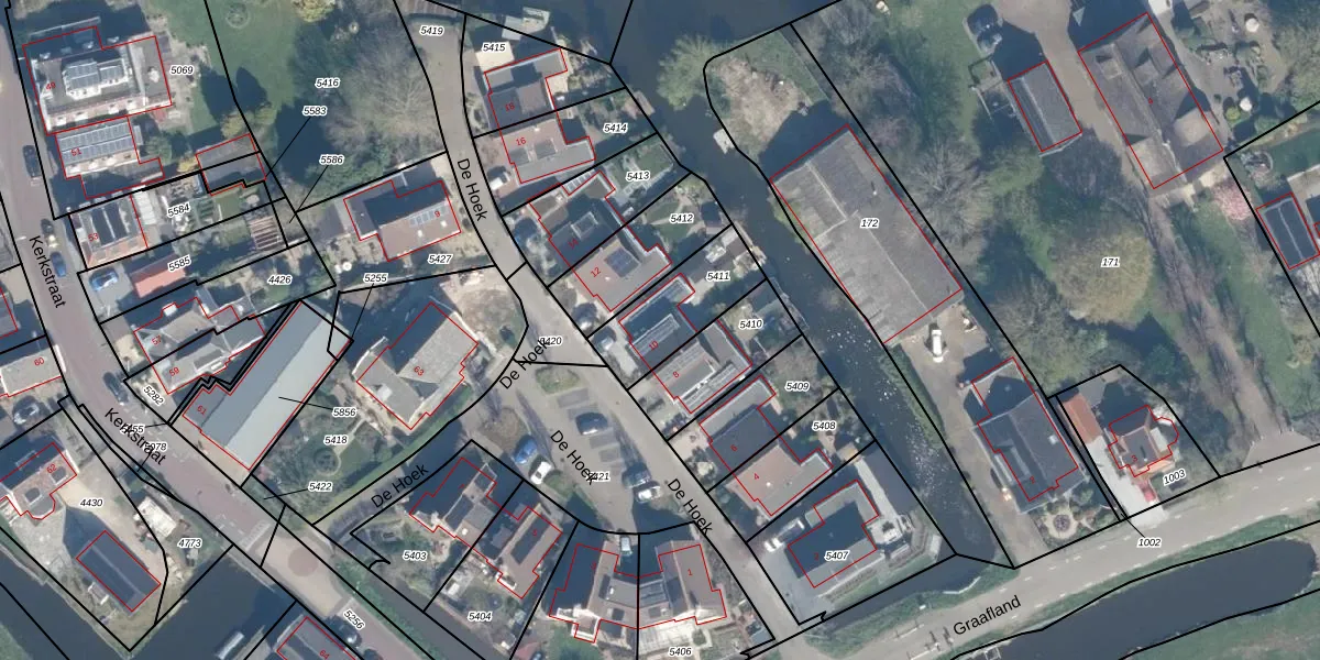 De Hoek 10 is gelegen op kadastraal perceel AMS02A5411. Deze kadastrale aanduiding is uniek en wordt gebruikt door het Kadaster om eigendomsrechten en andere zakelijke rechten vast te leggen. Het perceel maakt onderdeel uit van de kadastrale gemeente Groot-Ammers.