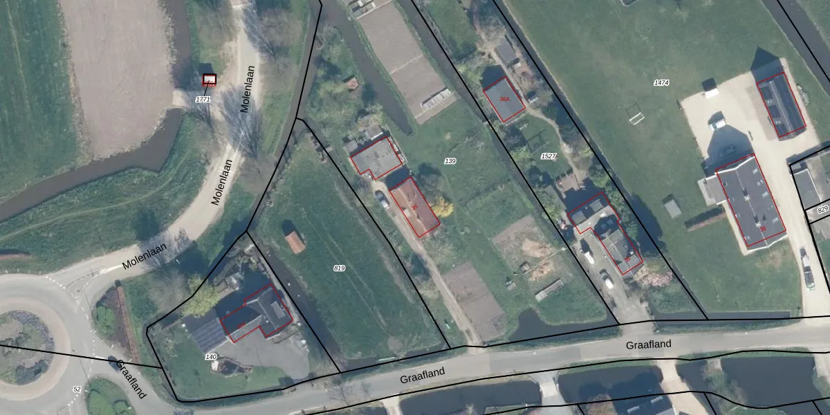 Het perceel waarop Graafland 35 staat heeft een oppervlakte van 3890 m². Dit is een zeer groot perceel. De perceeloppervlakte wordt geregistreerd door het Kadaster. Gedetailleerde informatie over de maten van dit perceel kunt u vinden in het rapport Kadastrale kaart met maatvoering van Graafland 35.