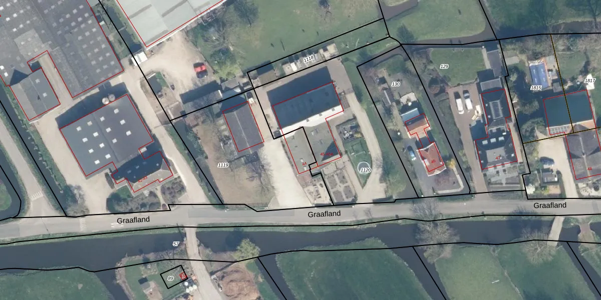Het perceel waarop Graafland 44 staat heeft een oppervlakte van 1307 m². Dit is een zeer groot perceel. De perceeloppervlakte wordt geregistreerd door het Kadaster. Gedetailleerde informatie over de maten van dit perceel kunt u vinden in het rapport Kadastrale kaart met maatvoering van Graafland 44.
