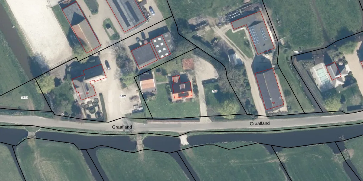 Het perceel waarop Graafland 55 staat heeft een oppervlakte van 1600 m². Dit is een zeer groot perceel. De perceeloppervlakte wordt geregistreerd door het Kadaster. Gedetailleerde informatie over de maten van dit perceel kunt u vinden in het rapport Kadastrale kaart met maatvoering van Graafland 55.