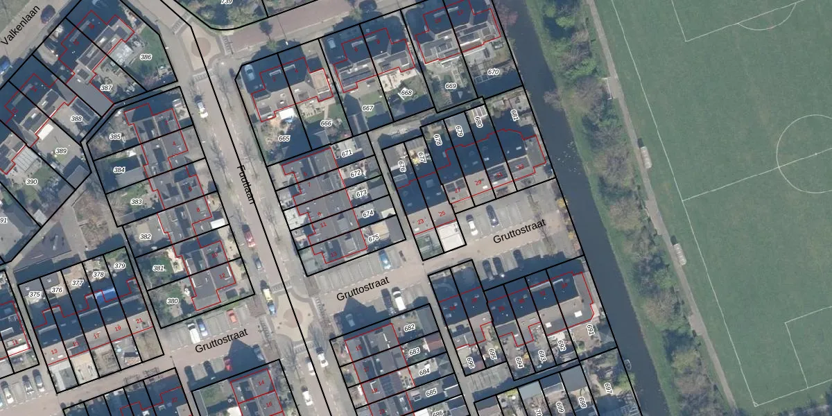 Het perceel waarop Gruttostraat 23 staat heeft een oppervlakte van 158 m². Dit is een middelgroot perceel. De perceeloppervlakte wordt geregistreerd door het Kadaster. Gedetailleerde informatie over de maten van dit perceel kunt u vinden in het rapport Kadastrale kaart met maatvoering van Gruttostraat 23.