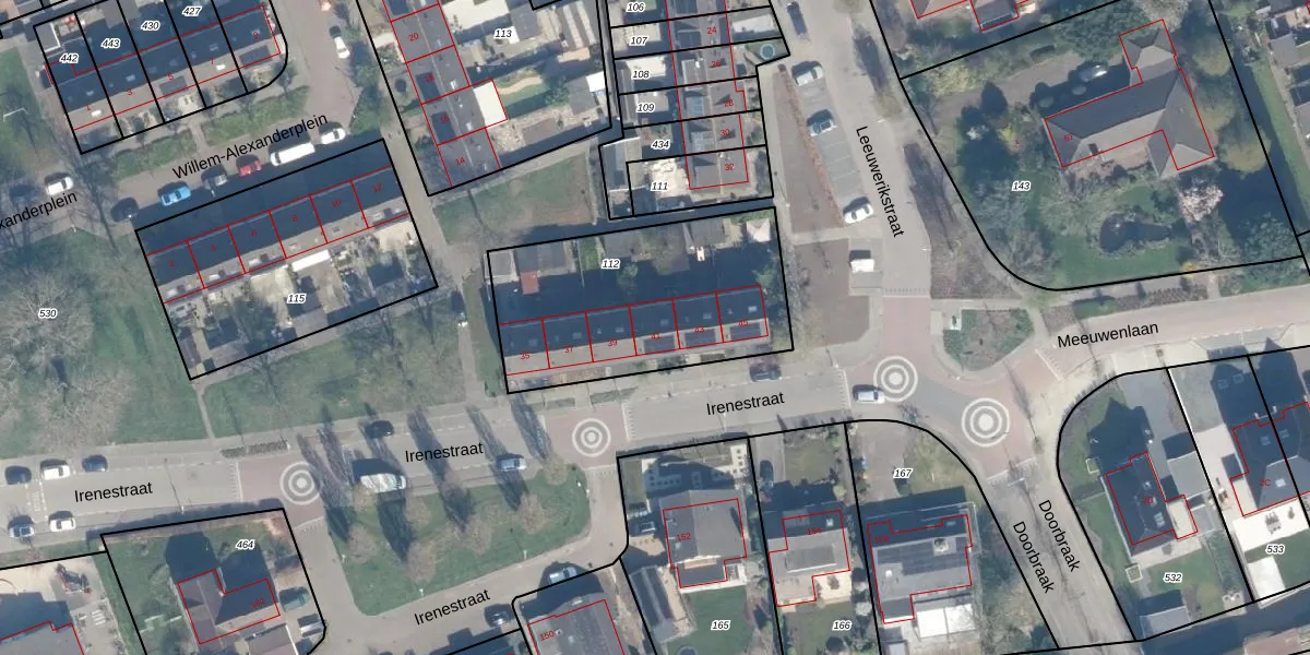 Het perceel waarop Irenestraat 41 staat heeft een oppervlakte van 970 m². Dit is een groot perceel. De perceeloppervlakte wordt geregistreerd door het Kadaster. Gedetailleerde informatie over de maten van dit perceel kunt u vinden in het rapport Kadastrale kaart met maatvoering van Irenestraat 41.