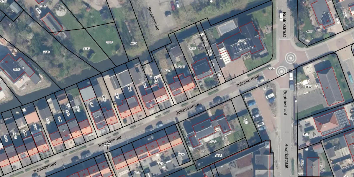 Julianastraat 33 is gelegen op kadastraal perceel AMS02A5834. Deze kadastrale aanduiding is uniek en wordt gebruikt door het Kadaster om eigendomsrechten en andere zakelijke rechten vast te leggen. Het perceel maakt onderdeel uit van de kadastrale gemeente Groot-Ammers.