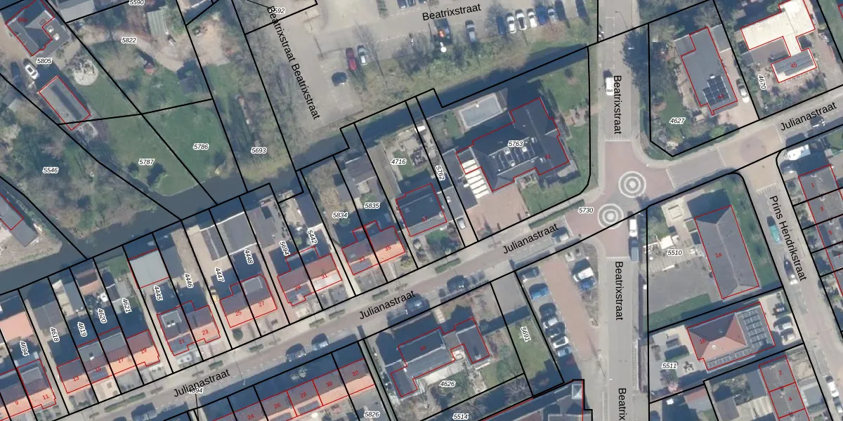 Het perceel waarop Julianastraat 37 staat heeft een oppervlakte van 480 m². Dit is een groot perceel. De perceeloppervlakte wordt geregistreerd door het Kadaster. Gedetailleerde informatie over de maten van dit perceel kunt u vinden in het rapport Kadastrale kaart met maatvoering van Julianastraat 37.